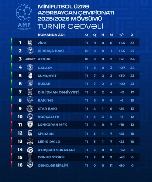 Minifutbol üzrə Azərbaycan çempionatında 11-ci turun oyunlarına yekun vurulub. İkinci oyun günündə 4 qarşılaşma keçirilib. Nəticələr belədir: CƏNUB STORM -...